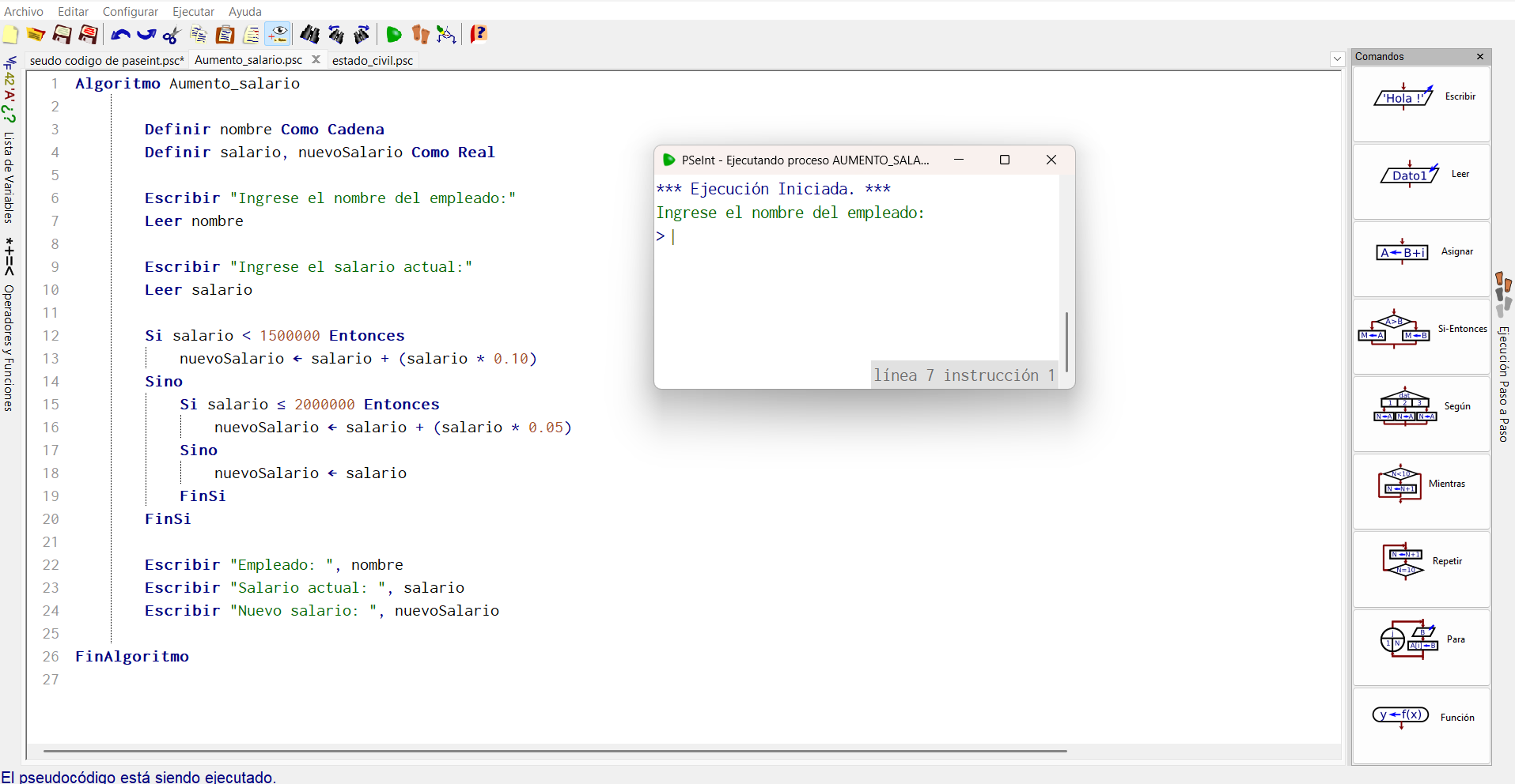 Elaborar un algoritmo que lea el nombre y el salario actual de un empleado y que calcule e imprima el nuevo salario de acuerdo con la siguiente condición: