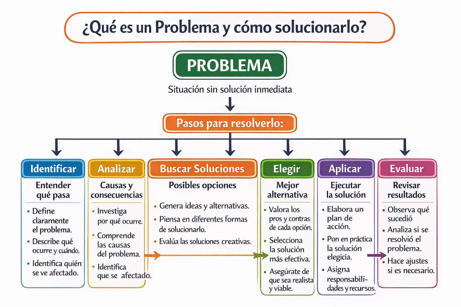 Para afrontar problemas de forma resolutiva es fundamental seguir un enfoque muy estructurado. En este sentido, existen una serie de pasos clave que nos pueden ayudar durante este proceso: